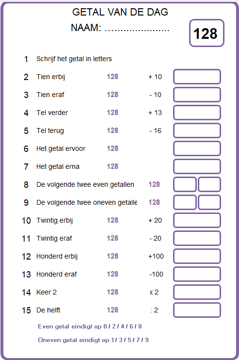 Print het blad - noteer het getal van de dag in het bovenste vak - print voor elke leerling een blad - werktijd: 5 minuten.