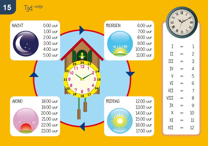 - 1x per week: de klokken van de dag